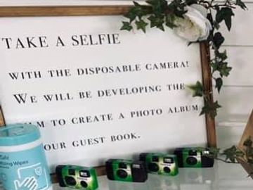 Text Reads: "Take a selfie with a disposable camera. We will be developing them to create a photo album of our guest book."